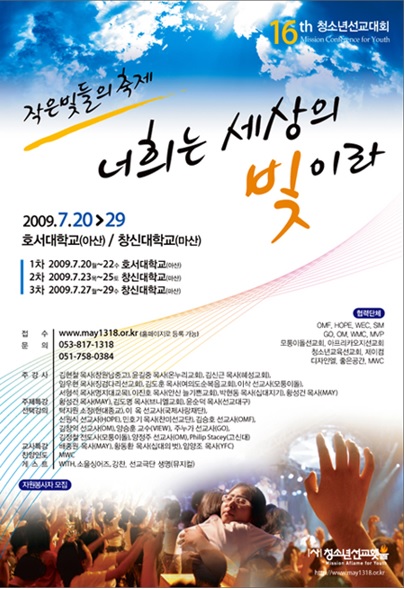 2009년 제16회 청소년선교대회 페이지 정보 작성자 관리자 댓글 0건 조회 1,102회 작성일 19-04-27 01:14 본문 2009년 제16회 청소년선교대회 '너희는 세상의 빛이라' 목록 이전글2009년 제9회 청소년영성캠프 19.04.27 다음글2008년 제8회 청소년영성캠프 19.04.27 댓글목록 댓글목록 등록된 댓글이 없습니다.